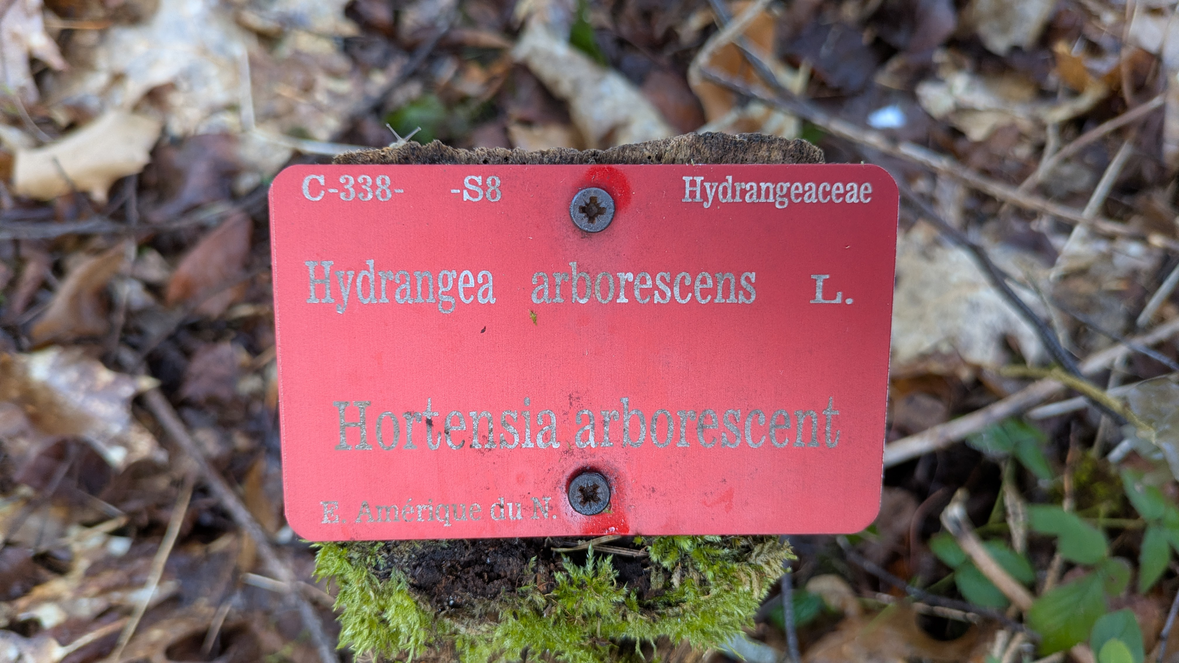 Essence Hortensia arborescent - Hydrangeaceae Hydrangea arborescens Sujet individuel Oui Position GPS Parcelle C338 Plaquette d'identification