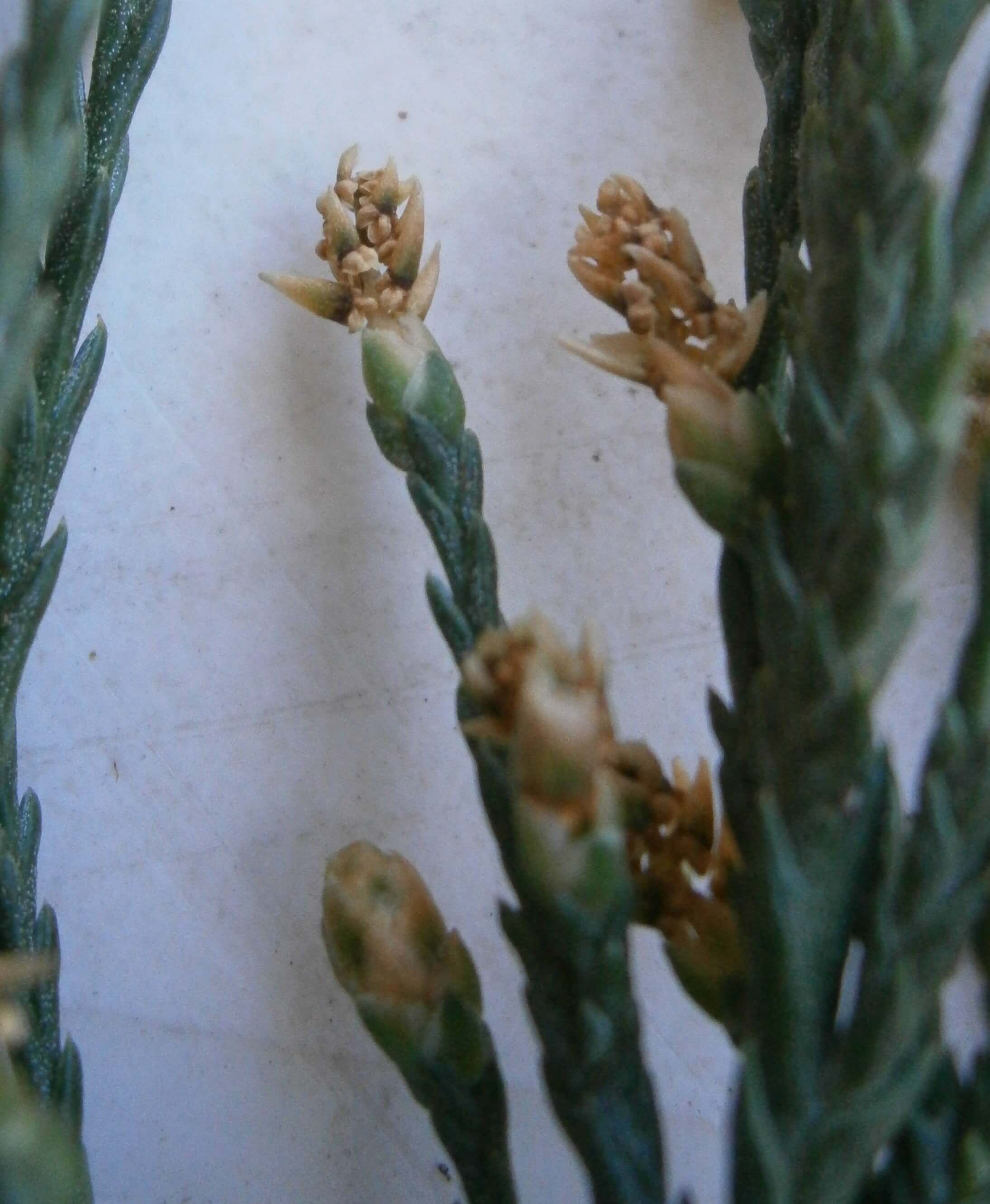 Les feuilles sont des aiguilles pointues en forme d'alènes, persistantes et arrangées en spirale autour de la tige, de couleur vert grisâtre et d'une longueur de 3 à 15 mm1. Elles dégagent une odeur d'anis quand on les froisse.