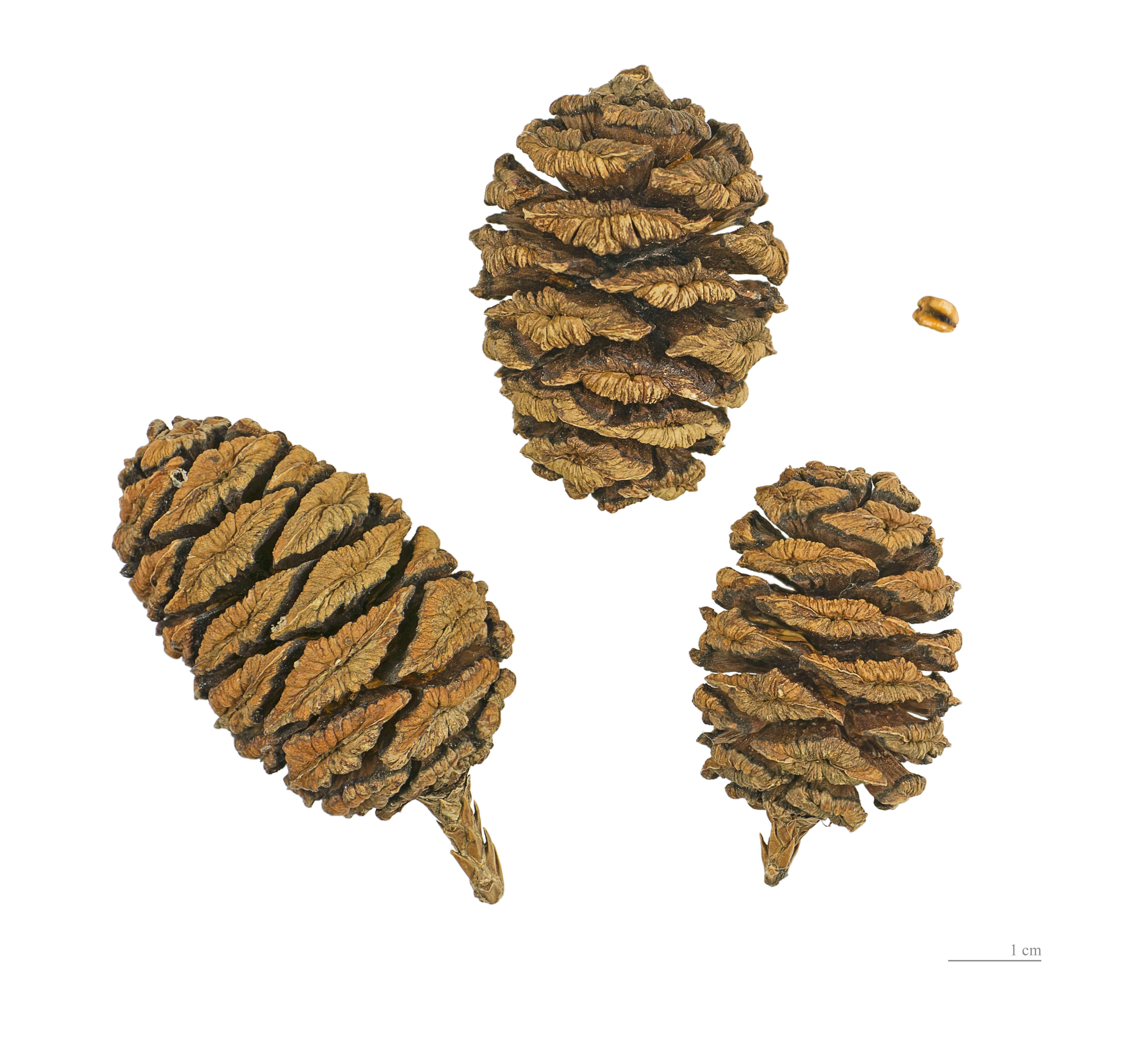 Arbre monoïque. Les fleurs mâles, situées à l'extrémité des rameaux, sont minuscules et jaunâtres (mars-avril). Les fleurs femelles, ovoïdes, sont érigées au sommet d'une petite tige écailleuse et brillante. Elles donnent des fruits qui mûrissent en deux ans et se présentent sous forme de cônes ovoïdes de 4 à 7 cm, constitués d'écailles (30 à 50 arrangées en spirale) ayant la forme de losanges aplatis. Chaque écaille abrite de 5 à 7 semences aux bords ailés1, ce qui donne une moyenne de 230 semences par cône. Ces fruits cônes peuvent rester en place sur l'arbre pendant plus de 20 ans. La graine, de couleur brun foncé mesure 4-5 mm de long pour une épaisseur de 1 mm avec 2 ailes brun-jaune de chaque côté.